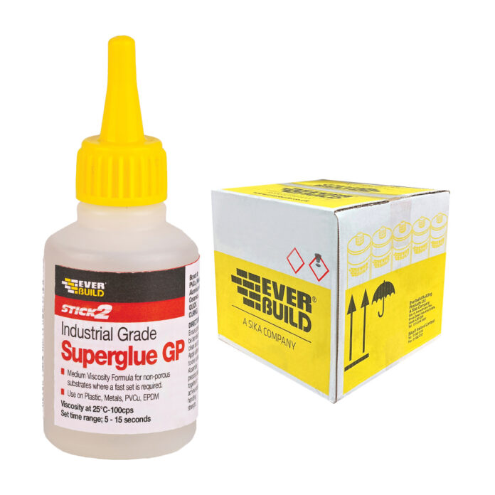 The glues and adhesives we sell are produced by Everbuild. Everbuild makes two main kinds of industrial superglue. The first is the GP grade for a super-fast setting, solvent-free bind. The second is the HV grade “high viscosity” which takes somewhat longer to set and works well on many surfaces, even porous ones.